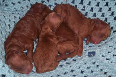 These puppies were born on Saturday 30 December. There are three red females and a small red male. The photo was taken on Saturday 30 December. They will be ready to go to their new homes when they turn eight weeks old on 24 February. The darkest puppy in this litter is not for sale. You can see an updated photo album of all these puppies. The photos were taken on 2 February, 2006. Click here to view the album. |